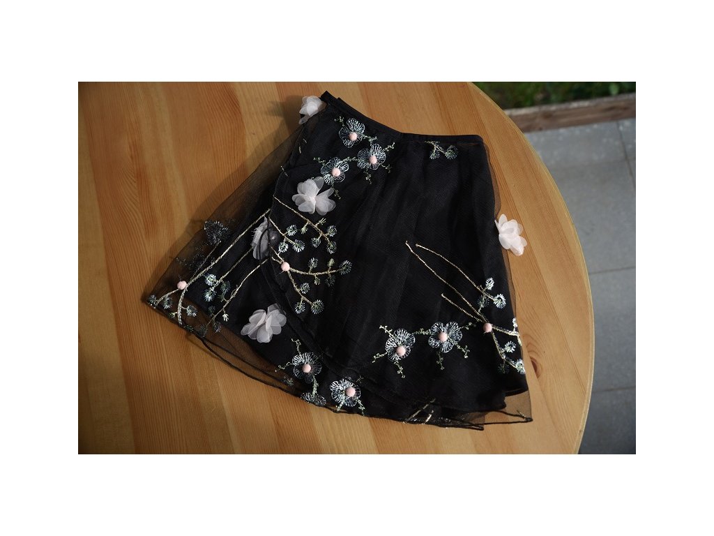 Baletní sukně s výšivkami květin, vhodná na tréninky. Dvouvrstvá. Univerzální velikost. Rozměry: šířka cca 90 cm (bez zavazování), délka cca 36 cm.