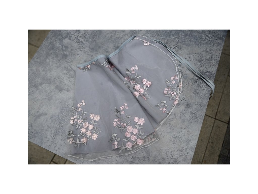 Baletní sukně s výšivkami květin šedá, vhodná na tréninky. Dvouvrstvá. Univerzální velikost. Rozměry: šířka cca 90 cm (bez zavazování), délka cca 36 cm.